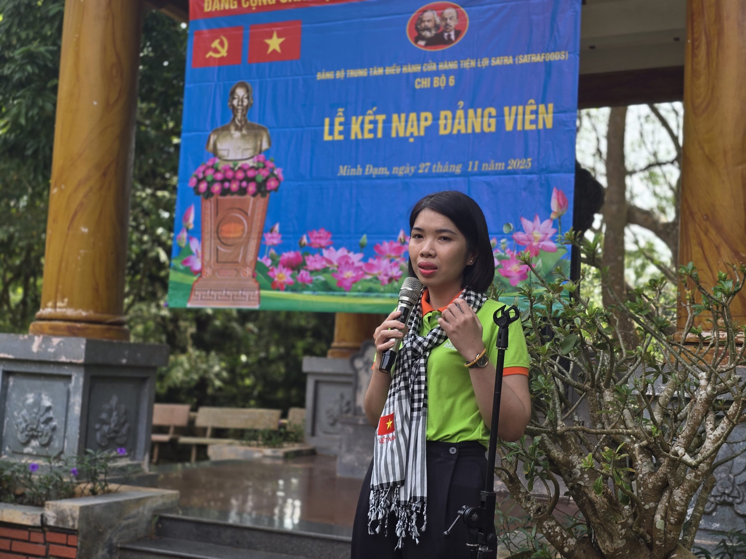 Trong chương trình, Chi bộ 6 – Đảng bộ Satrafoods đã tổ chức Lễ kết nạp Đảng cho quần chúng ưu tú Trần Thị Bích Nhung.
