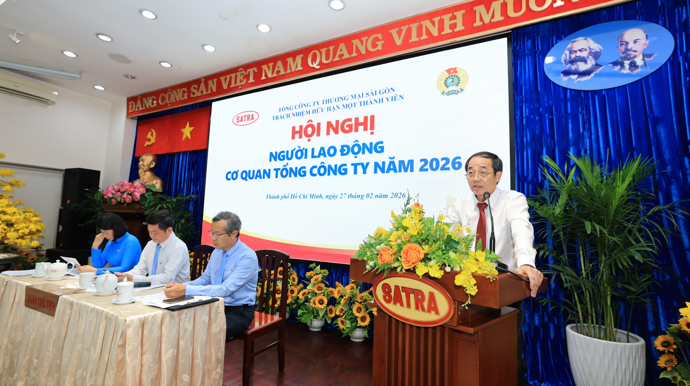Tham dự Hội nghị có các đồng chí: Lâm Quốc Thanh – Phó Bí thư Đảng ủy, Tổng Giám đốc, cùng các đồng chí trong Ban Thường vụ Đảng ủy, Hội đồng Thành viên, Ban Tổng Giám đốc, đ/c Phùng Đình Dũng – Chủ tịch Công đoàn SATRA cùng lãnh đạo phòng ban và 140 người lao động Cơ quan Tổng Công ty.